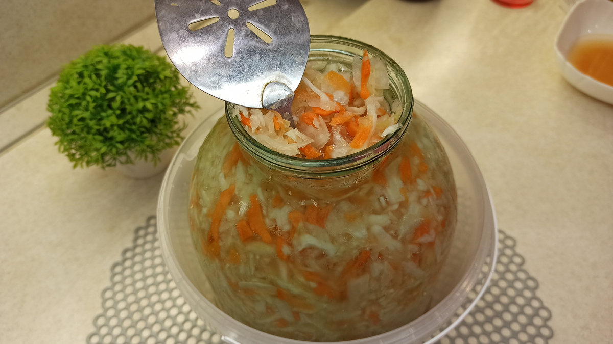 📌Ингредиенты на трёхлитровую банку: 3 кг капусты поздних сортов для квашения (сорта ранней капусты не подойдут) 3 столовые ложки соли 300 г моркови ✅Приготовление: Капусту нашинковать, переложить в большой таз, засыпать солью и помять до появления сока. Морковь натереть на крупной тёрке и добавить в капусту, перемешать. Трёхлитровую банку помыть, стерилизовать банку не требуется. В банку плотно набить подготовленную капусту, я утрамбовываю деревянной толкушкой, можно утрамбовать рукой, кулаком. Банку с капустой обязательно поставить в глубокую тарелку или другую глубокую ёмкость, поскольку сок при бражение будет выделяться и вытекать из банки. Капуста будет кваситься примерно 3 дня. Со второго дня в банке начнёт активный процесс брожение, сок будет пенится и вытекать из банки. Каждый день, 3-4 раза следует протыкать капусту до самого дна, выпуская углекислый газ, которые образуются в процессе молочнокислого брожения. Я это делаю ручкой от поварёшки. После протыкания и вы