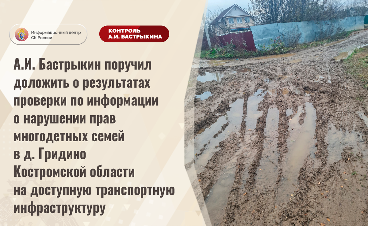 А.И. Бастрыкин поручил доложить о результатах проверки по информации о нарушении прав многодетных семей в д. Гридино Костромской области на доступную транспортную инфраструктуру В социальной сети сообщается, что на протяжении нескольких лет в деревне Гридино Костромской области подъездные дороги к земельным участкам многодетных семей находятся в ненадлежащем состоянии. В период осадков грунтовое полотно размывает, а также отсутствует уличное освещение. Многочисленные обращения результатов не принесли. В региональном следственном управлении организована процессуальная проверка. Председатель Следственного комитета Российской Федерации Александр Иванович Бастрыкин поручил руководителю СУ СК России по Костромской области Денису Николаевичу Левченко доложить о ходе и результатах процессуальной проверки. Исполнение поручения, а также ход процессуальной проверки поставлены на контроль в центральном аппарате ведомства. #СледственныйКомитет #СКРоссии #СКР #ИЦСКР #ИнформационныйЦентр #Александр