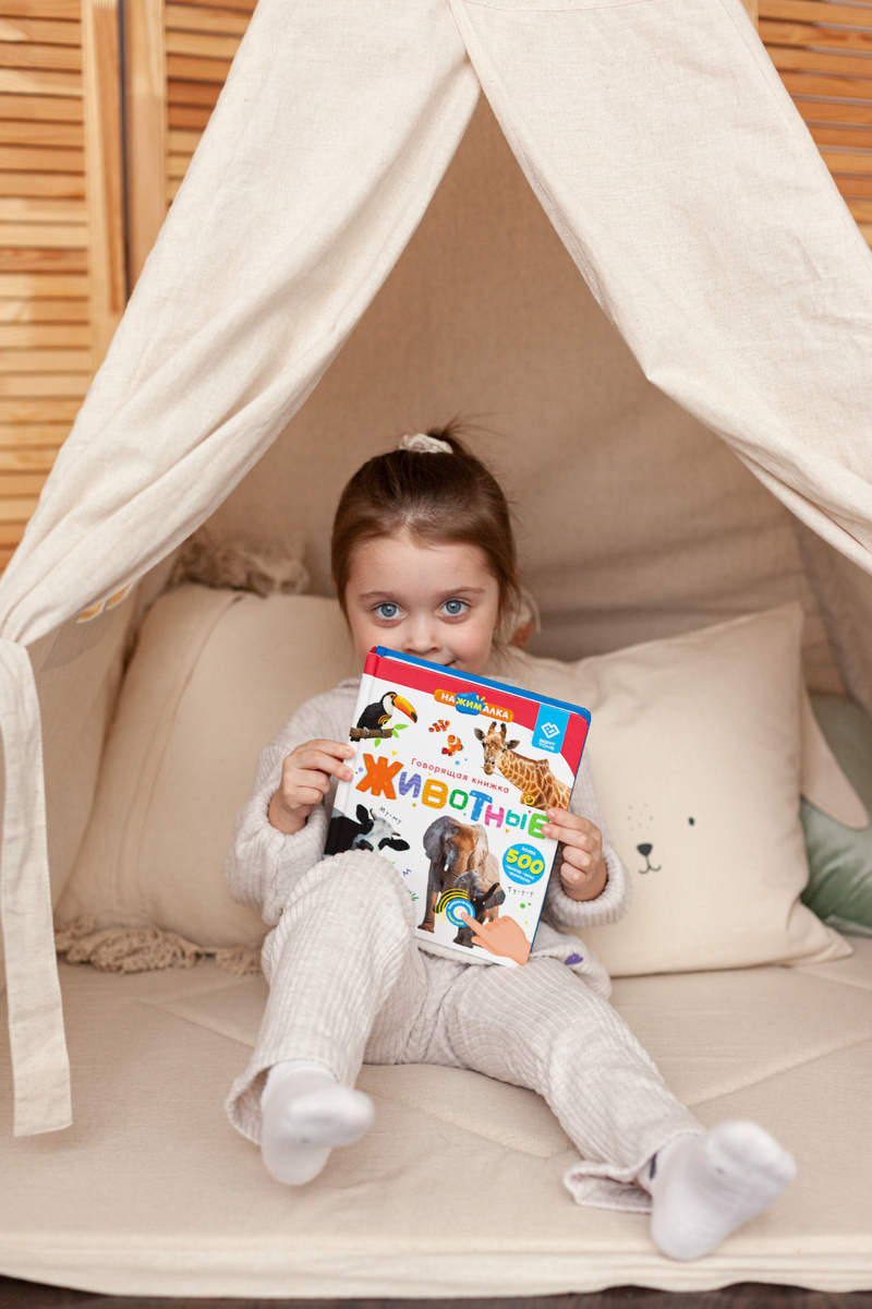 Сектор книг вполне можно разместить рядом с диваном, на котором мама обычно читает своему малышу. Это может быть одна полка, на которой уместятся актуальные по возрасту и часто читаемые книги, или даже небольшой контейнер-подставка. Остальное собрание книг можно хранить в шкафу вне детской зоны. Напомним, что книги, которые малыш может брать самостоятельно, должны быть достаточно прочными, например, как Нажималки от BertToys. С помощью говорящих книг «Животные», «Я и мир вокруг» ребенок может узнать много интересного и полезного для расширения кругозора. Кроме того, с этими книгами даже двухлетний ребенок может заниматься самостоятельно.