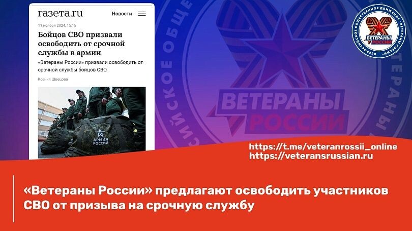 Общероссийское общественное движение «Ветераны России» обратилось к председателю Государственной Думы Вячеславу Володину с предложением на законодательном уровне освободить участников специальной военной операции (СВО) от обязательного призыва на срочную службу.
