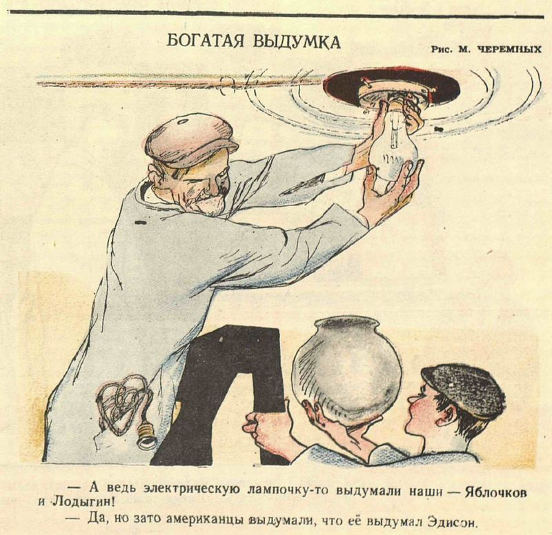 1947 год. Борьба с низкопоклонством перед Западом и заграницей в разгаре. Характерный рисунок: Михаил Черемных (1890—1962). «Богатая выдумка.