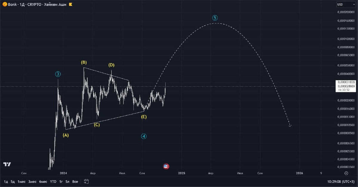 Сценарий актуален, происходит выход из треугольника вверх. Ожидаю реализацию потенциала фигуры в районе 0.00015, далее начало медвежьего рынка.