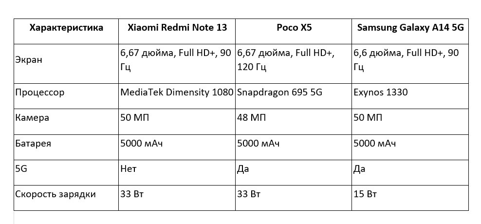 Xiaomi Redmi Note 13, Poco X5 или Samsung Galaxy A14 5G — давай разберемся, какой из этих смартфонов будет идеальным для тебя. Что важнее: мощная производительность, качественная камера или продолжительная работа от аккумулятора? Давай рассмотрим, какие особенности у этих моделей и какую из них выбрать в зависимости от твоих нужд.