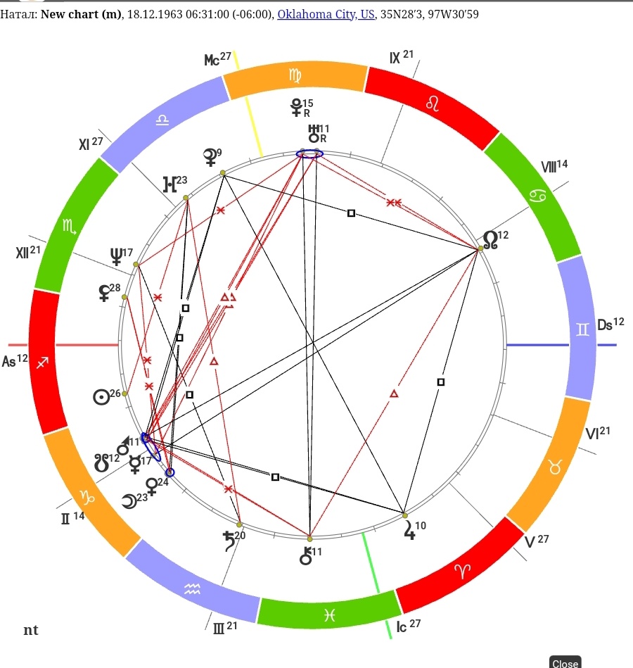 Уильям Брэдли Питт родился 18 декабря 1963 г. в 06:31ч. (Время рождения достаточно точное, берём его) в Шоуни, Оклахома, США.