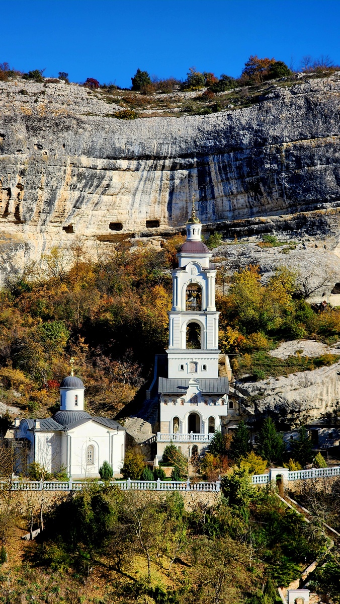 Поездка в Бахчисарай стала моим последним пунктом в череде путешествий по Крыму. На неё я решалась тяжело, потому что чувствовала себя неважно, но и усталость от сидения в четырёх стенах давила, хотелось на волю. К солнцу, небу, осенним пейзажам. И я позволила себя уговорить. Отправилась в Бахчисарай с приятельницей. Выехали рано. В дороге всё больше хотелось молчать и тихо наслаждаться поездкой. На автовокзале пересели на автобус до Старого города и поднялись к Свято-Успенскому мужскому монастырю. Людей было много. Пахло сдобой, которую выпекают тут же, при монастыре. Внутрь, в помещения, мы заходить не стали. Были уже. Покрутились снаружи, пофотографировали. Как интересно вписано творение рук человеческих в творение природы. Приехали мы в Бахчисарай чтобы ещё раз подняться на Чуфут-Кале и оттуда полюбоваться местной осенью. Как будто на Южном берегу её мало :) Я решила поискать Тайную лестницу, ту самую о котором когда-то прочла на канале "Жить в Севастополе", а затем нашла её в на