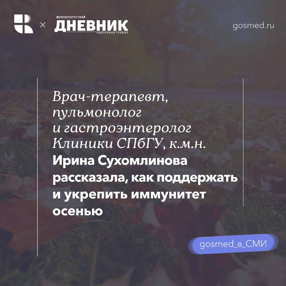 Врач-терапевт, пульмонолог, гастроэнтеролог поликлинического отделения № 4 Клиники высоких медицинских технологий им. Н.И. Пирогова СПбГУ, к.м.н Ирина Сухомлинова рассказала читателям интернет-издания “Петербургский дневник”, как поддержать иммунитет осенью. Врач отметила, что в холодное время года мы чаще проводим время в теплом закрытом помещении, которое является комфортной средой для распространения вирусов и бактерий, и мы с вами с легкостью делимся ими друг с другом. Наша социальная ответственность при простуде настолько высока, что мы предпочитаем не оформлять больничный лист, нанося вред не только себе, но и нашим коллегам. Для укрепления иммунитета Ирина Сухомлинова посоветовала придерживаться сбалансированного питания и физической активности в течение всего года, а главное - наладить свой режим: уделить внимание качественному сну, отдыху и общению с близкими. Простые профилактиктические меры - мытье рук, ношение средств индивидуальной защиты, своевременное обращение к врачу,