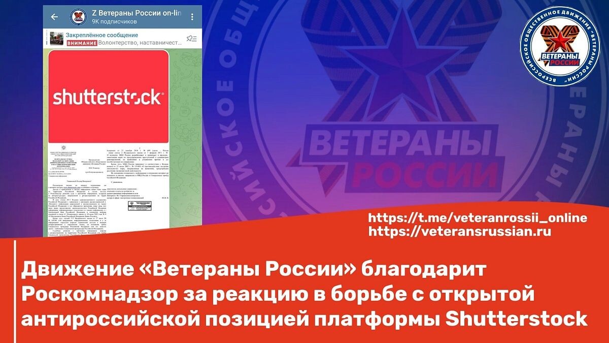 Движение «Ветераны России» благодарит Роскомнадзор за реакцию в борьбе с открытой антироссийской позицией платформы Shutterstock