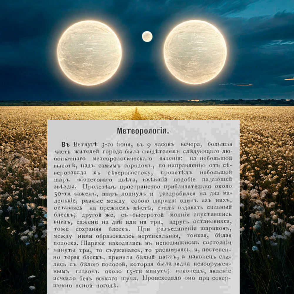 Исторические хроники Кажется будто Феномен #НЛО появился только во времена после второй мировой войны. Однако упоминания о них встречаются и в более древних источниках. Вот как описывается появление НЛО в Ветлуге в 1876 году, в журнале Всемирная Иллюстрация: В Ветлуге, 3 июня в 9 часов вечера, большая часть жителей города была свидетелем следующего любопытного метеорологического явления: На небольшой высоте, над самым городом, по направлению от северо-запада к северо-востоку, пролетал небольшой шар фиолетового цвета, имевший подобие падающей звезды. Пролетев пространство приблизительно около 50-ти сажень, шар лопнул и раздробился на два маленькие, равные между собой шарика: один из них оставаясь на прежнем месте, стал издавать сильный блеск. Другой же, с быстротой молнии спустившись вниз, сажени на две-три, вдруг остановился, тоже издавая блеск. При разъединении шариков, между ними образовалась вертикальная тонкая, белая полоска. Шарики находились в неподвижном состоянии минуты три,