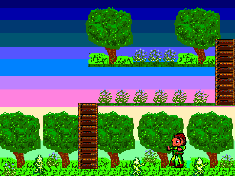 Пиксель арт на сегодня по мотивам видеоигры Elf для компьютерной системы IBM PC MS DOS. Это какая-то интересная бродилка. Про интересный мир. С красивой графикой. Там растут деревья и цветочки. И такое красочное небо. И такое интересное приключение. Как интересно, исследовать такие игровые миры с яркой графикой и хорошей фантазией. Как Джазовый Кролик (Jazz Jackrabbit), например. Или эта игрушка. А это мой пиксель арт по мотивам. В этом мире всего зеленого все всегда хорошо! Все хорошо у всех твоих друзей. Муравья и крота. Цыпленка и утенка. У лягушонка тоже все хорошо. Но тебе надо искать постоянно проникающих в этот мир зелеников, они маскируются под растения. И едят цветы. Это такие маленькие и вполне разумные человечки. Тебе надо всех их выгнать. Прыгнув на них. Это их отпугивает. И найти их портал. И закрыть его ключом. Зеленики, они когда приходят покушать цветы в какой-нибудь мир. То открывают портал дверку ключиком. И кидают ключик в какое-то место. Тебе надо найти это место и