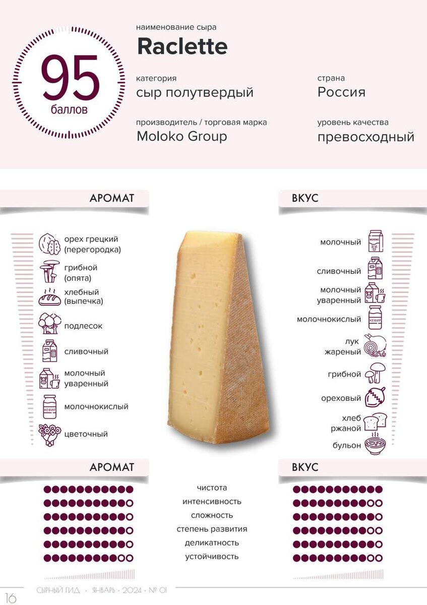 • Raclette, Moloko group Отличный образец раклета - внешне, по ароматическому и вкусовому профилям, послевкусию. У сыра отличный баланс во вкусе и нежная консистенция, особенно ближе к центральной части. Хороший вариант для украшения сырной тарелки сыром с интенсивным и сложным ароматическим профилем.