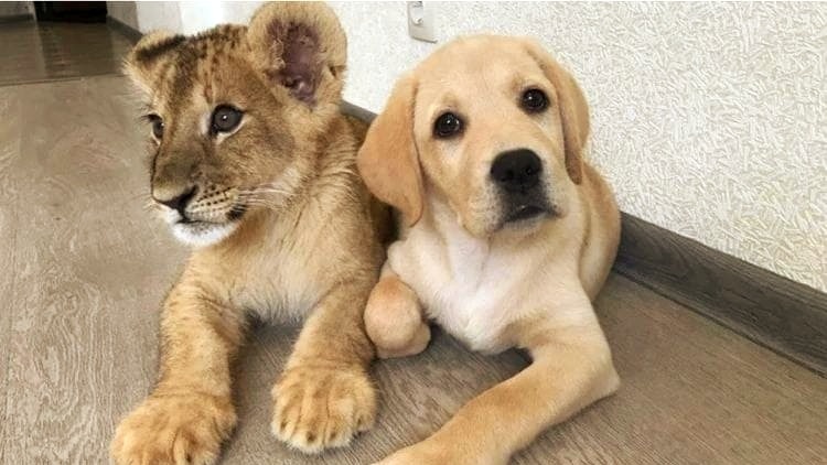 Лабрадор Эльза и львёнок Фортис появились на свет в одном городе (Иркутск) и с небольшой разницей во времени.