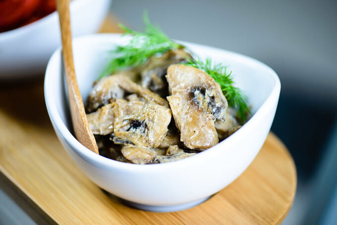 Этот мой рецепт не менялся на протяжении многих лет и является одним из наших самых любимых способов приготовления грибов, которые мы либо собираем в сезон, либо покупаем в магазине. Для этого рецепта можно использовать практически любые грибы, и я уверена, что в сочетании с пастой он будет не менее хорош. Поскольку это очень простой рецепт, я надеюсь, что вы скоро его приготовите и расскажете мне, как всё прошло. Разрежьте свежие грибы на четыре части, а затем на более мелкие ломтики. Нарежьте небольшую луковицу полукольцами. Выложите 70 г несолёного сливочного масла в сковороду среднего размера и растопите на среднем огне. Обжарьте лук до прозрачности или до слегка золотистого цвета. В этот момент увеличьте огонь до средне-высокого, добавьте в сковороду грибы, 1/2 ч. л. соли, 1/8 ч. л. чёрного перца и обжаривайте всё, пока из грибов не выпарится влага и они не начнут слегка золотиться. Вы заметите, как грибы начнут аппетитно шипеть. Старайтесь не пережаривать их. Добавьте 1/3 стакана