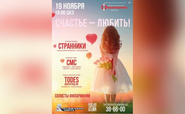 Центральный концертный зал Волгограда приглашает на большой концерт «Счастье – Любить!». Организаторы обещают настоящий праздник для слушателей всех возрастов. Среди исполнителей — солисты Волгоградской филармонии, эстрадный ансамбль «Странники» (художественный руководитель Вячеслав Скворцов), вокальная студия «СМС» (руководитель Юлия Наумкина, хореограф Влада Клименко), школа-студия Аллы Духовой «TODES Волгоград-Юг» (руководитель Лилия Богданович), солисты балета театра «Царицынская опера». Прозвучат всеми любимые песни, фрагменты мюзиклов известного творческого дуэта — композитора Егора Шашина, поэта Натальи Кузьминых. На сцену выйдут замечательные танцоры и вокалисты. Концерт состоится 19 ноября, начало в 19 часов. 6+