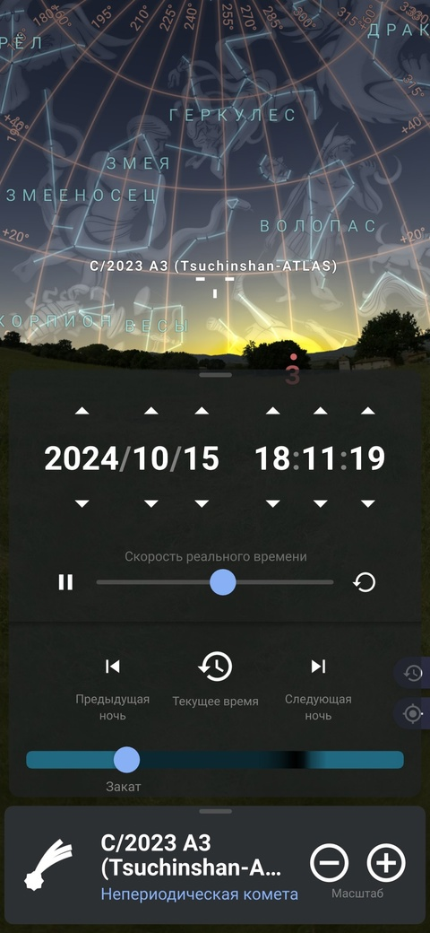 Одним из самых ярких явлений 2024г станет появление хвостатой странницы: Кометы C2023 A3 Tsuchinshan-Atlas. По предварительным оценкам, комету можно будет увидеть даже невооружённым глазом! Но ещё эффектней ее разглядывать в бинокли или небольшие короткофокусные телескопы с большим полем зрения. Наблюдения стоит начинать с 13го октября, около 18-00. И так далее каждый вечер, вплоть до конца месяца. Причем она будет подниматься все выше над горизонтом, а потом будет снижаться. Смотреть надо на Юго-западо-запад, примерно как на скриншоте. Удобной локаций для наблюдения может быть пляж Чемтоквадже. В этом месте минимальна искусственная засветка и легко добраться на жд Ласточке. Возможно будет организован клубный астровыезд в район Солох-Аула с 70мм бинокуляром, в локацию с хорошо открытым юго-западным горизонтом. Всем ясного неба и успешных наблюдений!