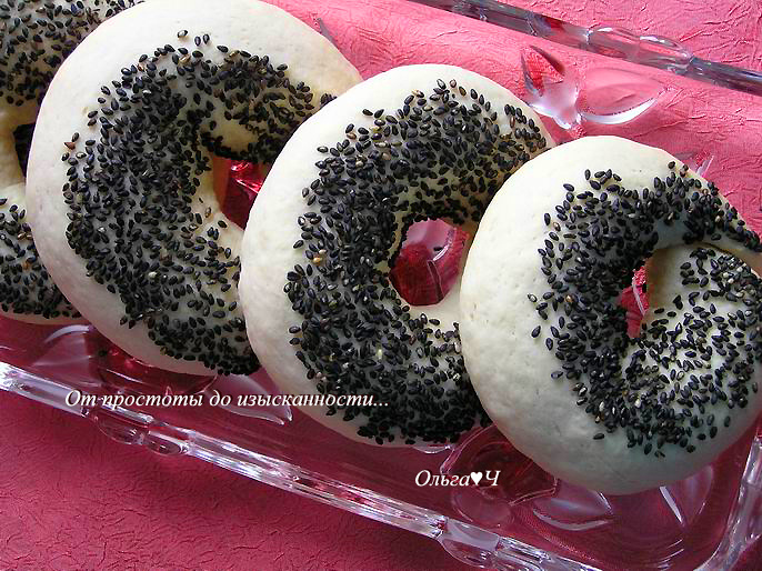 2-3 ст. л. черного кунжута Приготовление: Вино смешайте с сахаром до растворения, добавьте ванилин, влейте масло. Всыпьте муку с разрыхлителем и солью. Замесите эластичное тесто. Тесто разделите на 6-8 частей (бублики на 6 частей показались мне слишком большими). Каждую часть скатайте в "колбаску", соедините края, формируя бублик. Каждый бублик обмакните в кунжуте с одной стороны, выложите на противень, застеленный бумагой для выпечки. Выпекайте при 180*С 25-30 минут, остудите и подавайте. Приятного аппетита! Вам также могут понравиться: