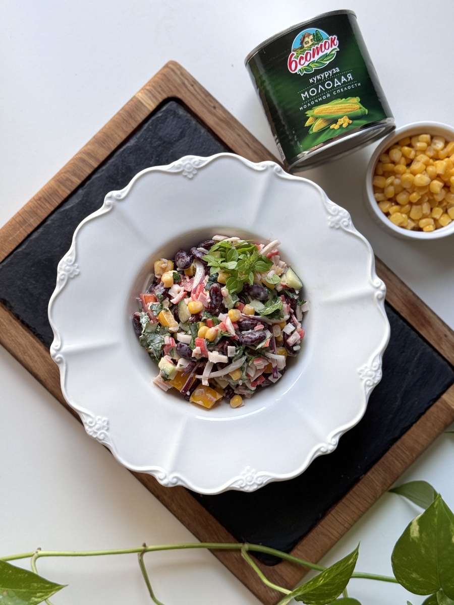 - В салатнике соединяем фасоль, кукурузу, крабовые палочки, лук, огурец, перец. Заправляем салат, посыпаем рубленной кинзой, перемешиваем и подаем.