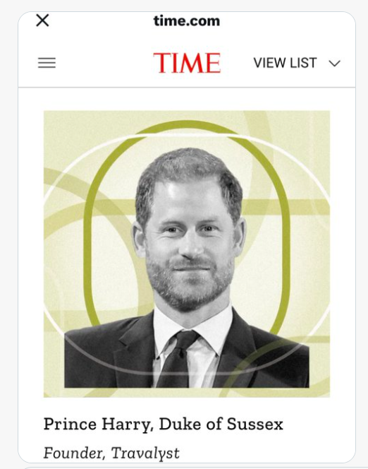Принц Гарри, как основатель Travalyst, стал одним из 100 самых влиятельных лидеров по версии TIME, которые ведут бизнес к реальным действиям по борьбе с изменением климата. Travalyst - некоммерческая организация, которая предоставляет людям, планирующим поездки, данные о выбросах, чтобы они могли выбрать наиболее экологичные варианты. Цель состоит в том, чтобы уменьшить углеродный след отрасли; на туризм приходится около 11% глобальных выбросов парниковых газов. В списке он под пятым номером серди Титанов. Первый - Аджай Банга, президент Всемирного банка, за ним - Дженнифер Гранхолм, министр энергетики США. Третий - Билл Гейтс, основатель компании Breakthrough Energy и TerraPowe. Четвёртое место - Сюзанна Мухамад, министр окружающей среды и устойчивого развития Колумбии. И пятый - герцог Сассекский. Остальные на скрине с сайта: Мэр Парижа конечно же, насмешила. Её внесли в этот список за то, что введением налога на транспорт сокращает выбросы от автомобилей. И за то, что Сена с