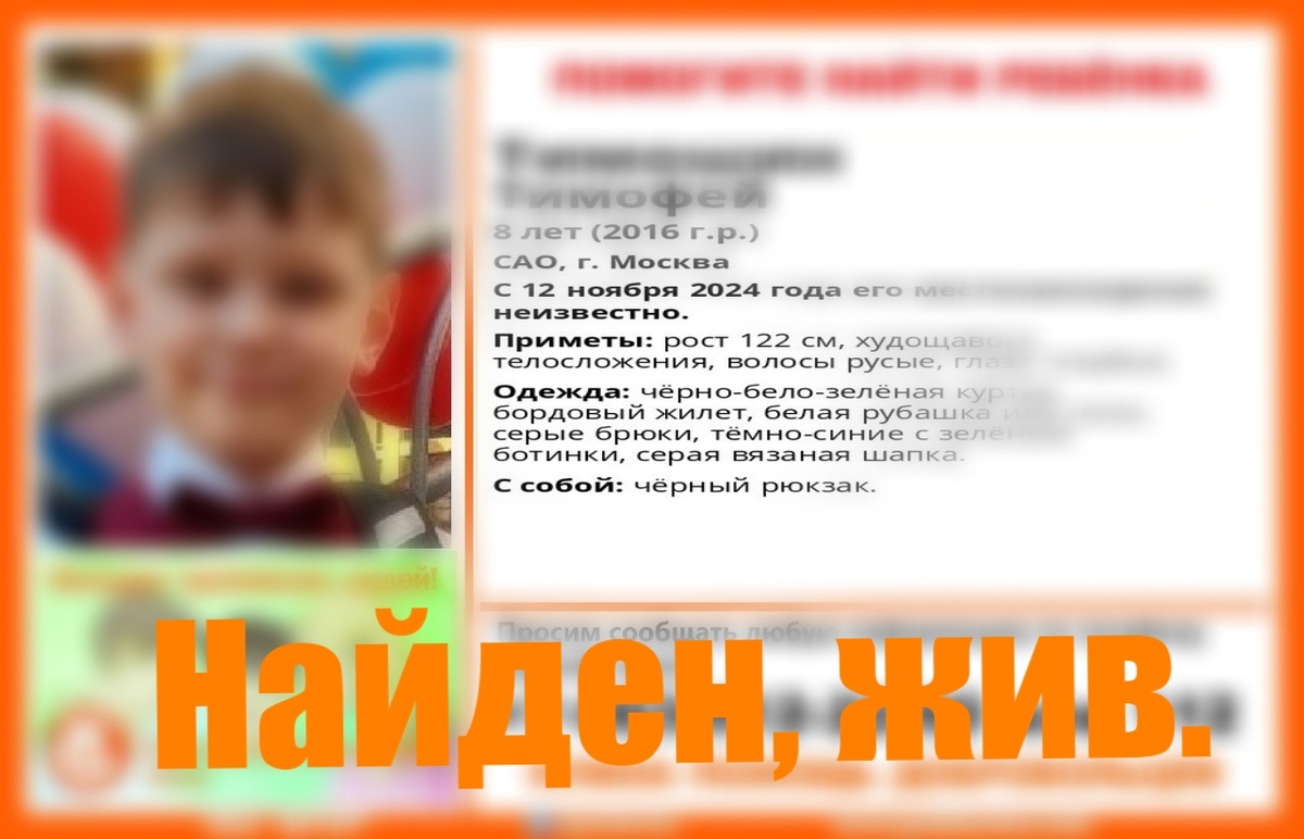 Пропал #Тимошин Тимофей, 8 лет, #САО, г. Москва. С 12 ноября 2024 года его местонахождение неизвестно. если у вас есть сведения, которые могут посодействовать поиску, писать СЮДА
