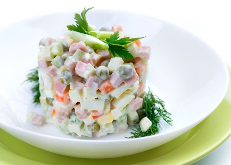 Оливье — салат с отварными овощами, мясом (обычно курицей или колбасой), яйцами и майонезом. Также популярны закуски, такие как селедка под шубой и пироги.