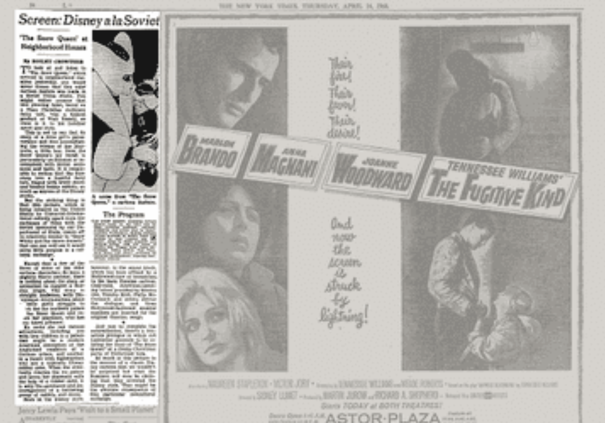 В апреле 1990 года в газете The New York Times вышла статья Босли Кроутера под названием "Дисней в стиле СССР", посвященная советскому мультфильму 1957 года. Статья не очень большая. Сохранился скрин полосы, где она была напечатана: Это верхняя половина газетной полосы. нижнюю мы обрезали, а то колонка выглядела совсем мелкой. Качество ужасное, но, к счастью, The New York Times выложила на своем сайте электронную версию статьи. Написано там следующее: "Посмотрев «Снежную королеву» и послушав ее, вы бы никогда не подумали, что этот цветной полнометражный мультфильм был снят на студии в Советском Союзе. Скорее, можно было бы предположить, что эта милая сказка, основанная на сказке Ганса Христиана. Андерсена, является типичным продуктом Уолта Диснея, настолько она близка к его знакомому духу и стилю. Это не значит, что история о том, как настойчивость и любовь маленькой девочки помогли освободить ее товарища по играм, маленького мальчика, из ледяных оков Снежной Королевы, звучит не по-рус