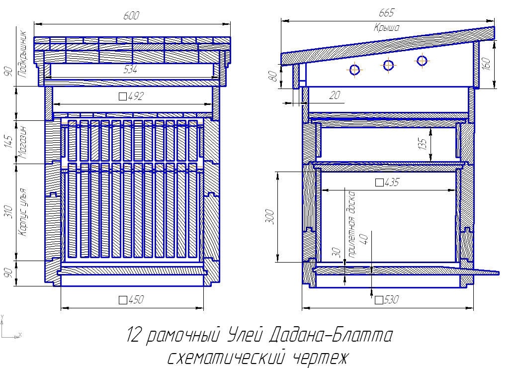 При сколачивании дно и торцевые стенки прибиваются вовнутрь между боковыми стенками. Между дном и передней стенкой образуется 8-мм щель для летка, а сверху передняя и задняя стенки опускаются на 1 см ниже боковых стенок корпуса, что служит местом для подвешивания плечиков гнездовых рамок.