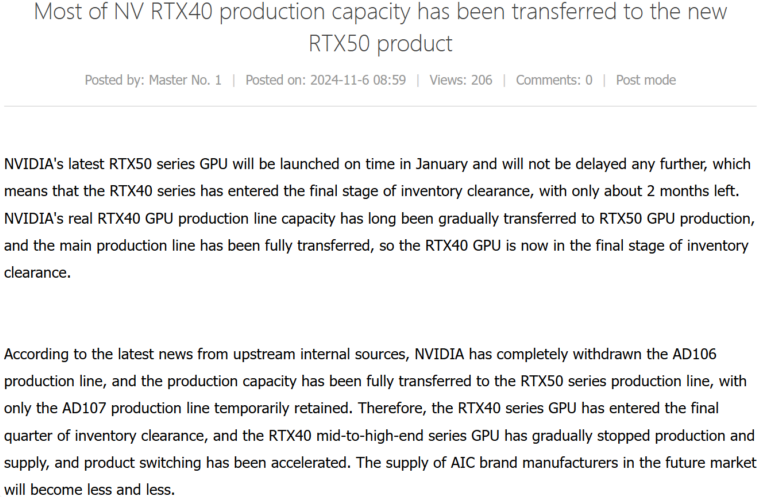 Компания NVIDIA в настоящее время проводит корректировку своих производственных линий, практически полностью переключаившись на графические процессоры следующего поколения. Хотя официальной информации не было, в сети ходит много слухов. Ожидается, что NVIDIA официально представит новое поколение видеокарт в начале 2025 года на мероприятии CES 2025 и вскоре после этого выпустит первые продукты серии RTX 50, возможно, в течение нескольких недель.