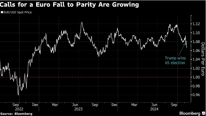 «Это худший сценарий для евро», — сказал Марк Маккормик, глобальный руководитель стратегии FX и EM в TD Securities. Он ожидает, что евро упадёт до $1,03 к моменту вступления Трампа в должность в январе. После этого паритет станет реальностью, сказал он.