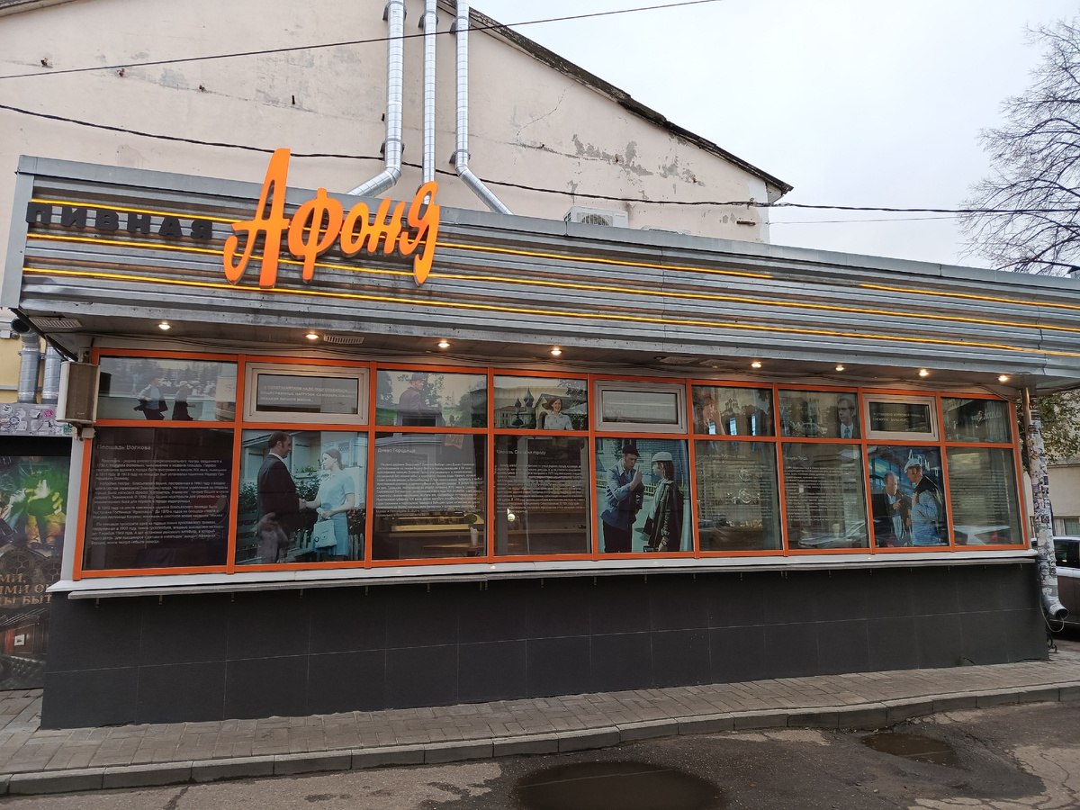 По совету нашего экскурсовода решили посетить бар "Афоня" и заодно продегустировать местный пенный разливной напиток, а то как же- были в Ярославле и не попробовали! Бар находится в центре, но во дворах, его еще надо найти. Мы поступили проще- вызвали такси от Речного вокзала и доехали до адреса: ул. Нахимсона, д.21А. Сами только здесь узнали, что фильм "Афоня", который смотрели несчетное количество раз и всегда с удовольствием, снимался в Ярославле и окрестностях. Именно этому факту и посвящён бар, и он даёт возможность вернуться в старые добрые советские времена. Выполнен в форме "стекляшки": Снаружи запечатлены сцены из фильма с описанием, где конкретно они снимались. Внутри пивной на стенах- тоже сцены из фильма. За стойкой- буфетчица в белой наколке. Разливные соки в стеклянных конусах. Вяленая рыба. Из закусок внимания заслуживают (если исходить из советских времён) бутерброды с колбасой, сыром, рыбой, селёдка с картошкой и луком или просто с луком, варёное яйцо под майонезом,