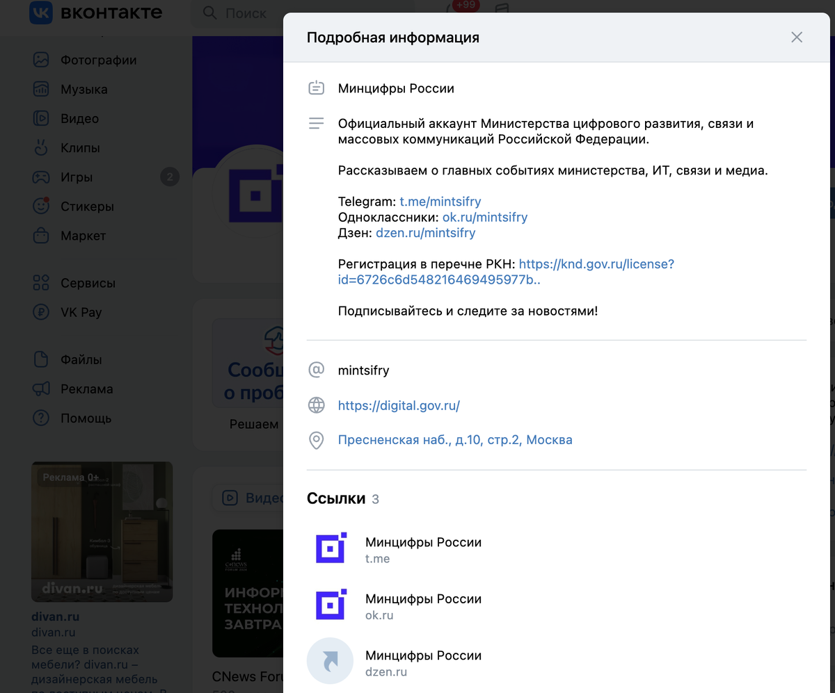 Минцифры рекомендуют разместить следующую информацию в верхней части персональной страницы рядом с ее наименованием и сведениями, содержащими информацию о пользователе канала/страницы: