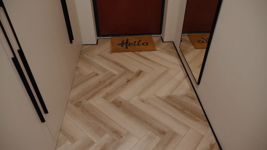 Единственная сложность возникла с плинтусом. В этой квартире, чтобы подчеркнуть минималистичный дизайн интерьера в бежевых тонах, использован горизонтальный микроплинтус. Чтобы его скруглить, пришлось делать надрезы, поэтому итоговый результат неидеален: есть заметные складки и морщины.