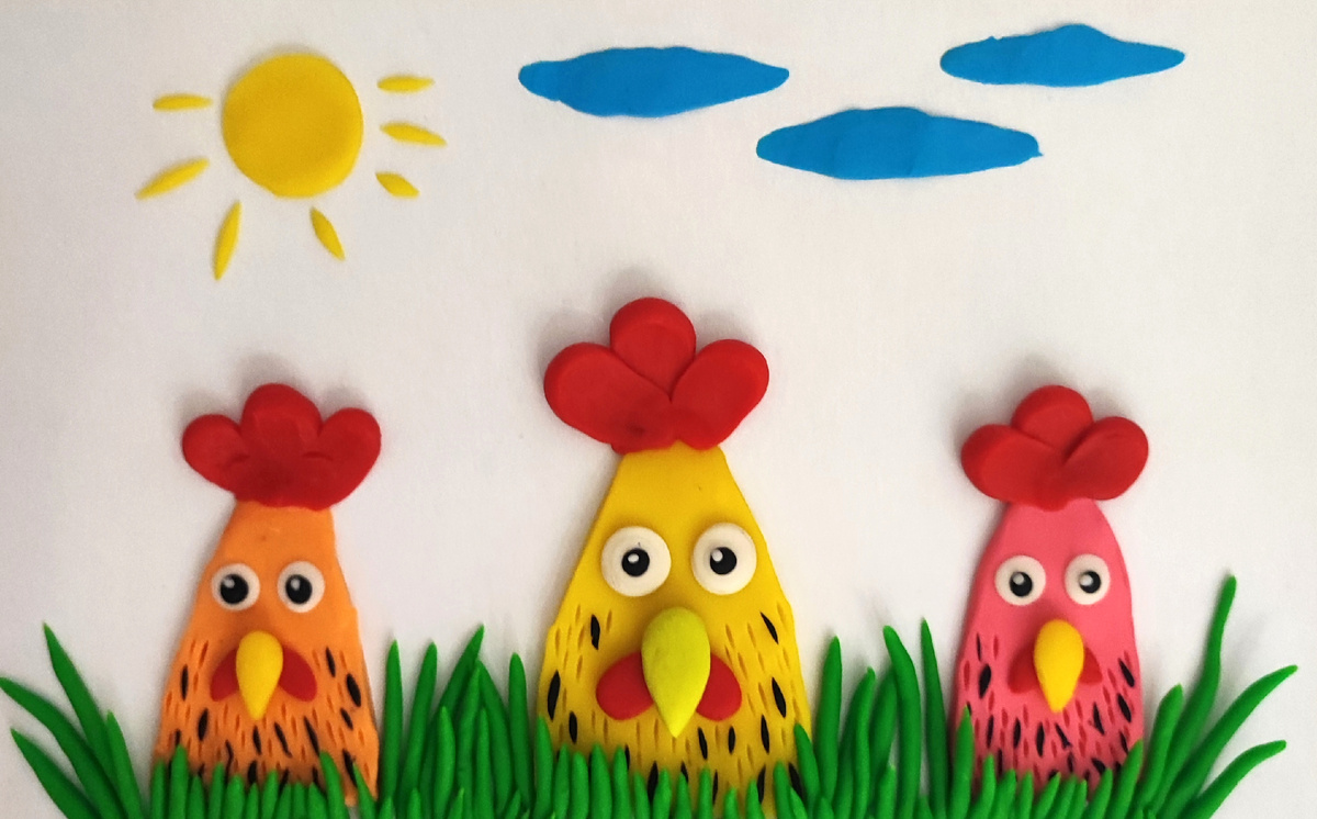 Аппликация из пластилина на картоне " Домашние птицы- петушок и две курочки".