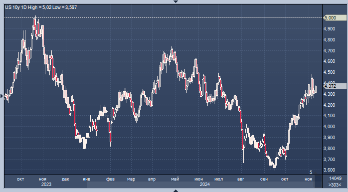 Фондовый рынок находится на рекордных максимумах благодаря победе Дональда Трампа на выборах. Тем временем облигации резко упали после выборов. По словам JPMorgan, в поисках признаков усталости от "торговли Трампа" инвесторам следует следить за доходностью 10-летних казначейских облигаций. График доходности 10-летних гособлигаций США интервалами в 1 день В связи с тем, что победа Дональда Трампа на президентских выборах вызвала энтузиазм на рынке, акции и криптовалюты достигли рекордных максимумов. JPMorgan советует инвесторам, которые ищут признаки усталости от роста, обратить внимание на рынок казначейских облигаций. В новом исследовании команда по стратегии акций компании заявила, что доходность 10-летних казначейских облигаций на уровне 5% может стать переломным моментом для акций США. В настоящее время доходность составляет около 4,3%. «Мы полагаем, что примерно через 5% влияние доходности облигаций на оценку акций начнёт меняться с позитивного/рефляционного на растущую обеспокоен