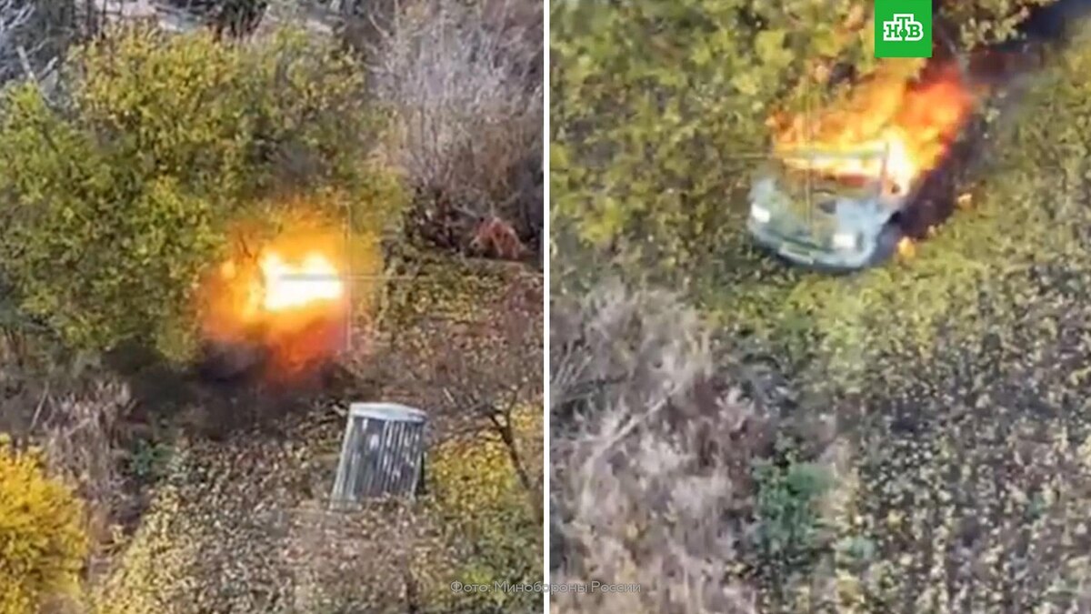[ Смотреть видео на сайте НТВ ] Российская группировка «Север» ликвидировала замаскированный украинский автомобиль с помощью FPV-дрона. Кадры операции показало Минобороны РФ. Разведчики «Севера» засекли с дрона автомобиль ВСУ. Противник спрятал машину в одном из населенных пунктов в курском приграничье. Российские военнослужащие запустили FPV-дрон, который прямым попаданием взорвал транспорт ВСУ. Цель была поражена, начался пожар, что подтвердили кадры объективного контроля. [ Смотреть видео на сайте НТВ ]