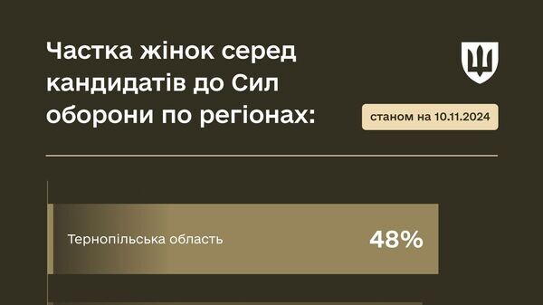 Тернопольская область заняла первое место по количеству женщин, обратившихся в центры рекрутинга украинской армии. Об этом сообщает Минобороны Украины. Согласно официальным данным, женщины составили 48% от обратившихся в рекрутинговые центры с целью поступить на службу в ВСУ. "Следом идут Черновицкая (44%) и Черниговская (39%) области. В среднем по стране доля женщин составляет 19% среди всех кандидатов через центры рекрутинга", - констатировали в Минобороны Украины. Там также отметили, что всего на Украине сейчас работает 44 центра рекрутинга. Они предлагают более 10 тысяч вакансий в ВСУ, Нацгвардии, Госпогранслужбе и СБУ. Предоставление консультационных услуг осуществляется по принципу конфиденциальности. В центрах рекрутинга не раздают повестки. На сегодняшний день в Украине работают 44 центра рекрутинга. Ранее в Минобороны Украины констатировали показатели по рекрутингу женщин существенно ниже. Так, в июне в Минобороны сообщало, что женщины составляли десятую часть от общего количе