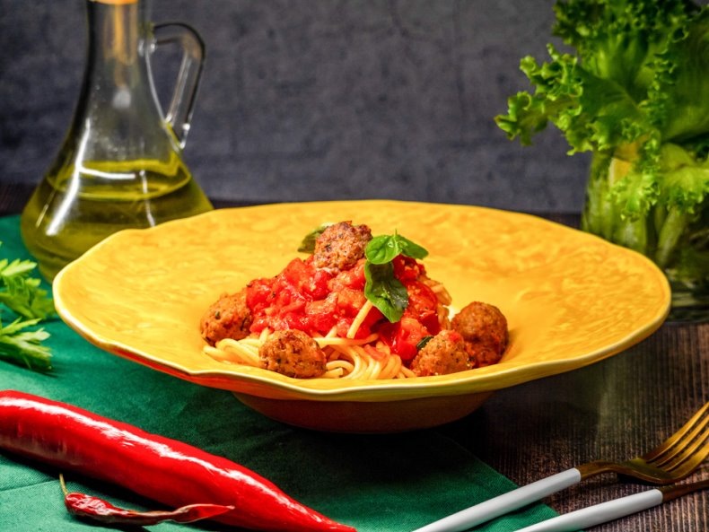 Настоящее удовольствие для гурманов – запеченные фрикадельки со спагетти al dente, томленные в густом томатном соусе с ароматным базиликом. Идеальное сочетание ингредиентов, которое никого не оставит равнодушным! • Свино-говяжий фарш – 300 г