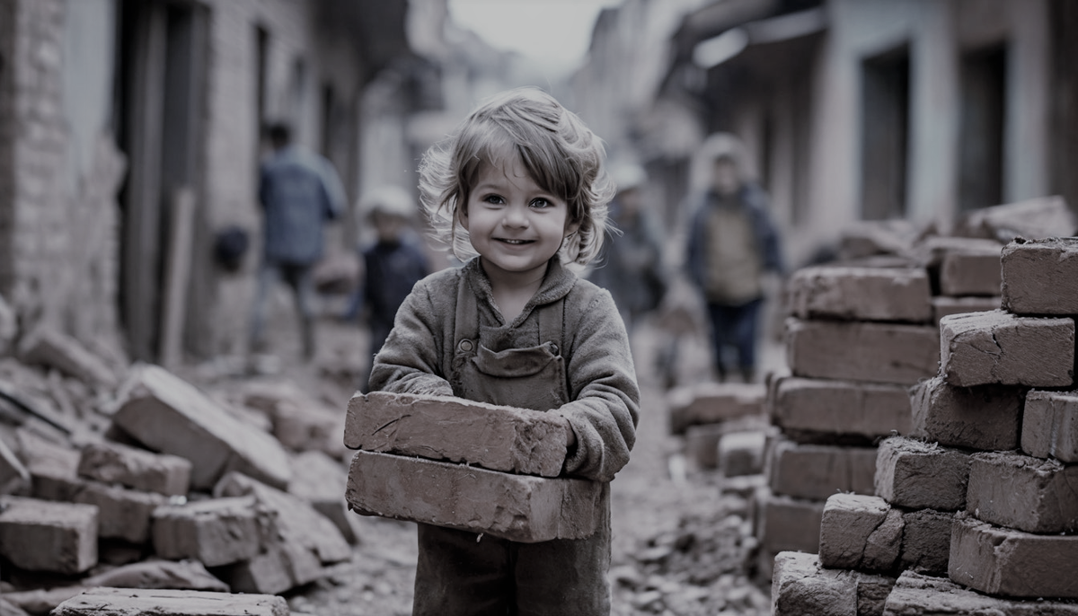 А маленькая Аннушка с большим энтузиазмом помогала таскать небольшие кирпичики к месту работ.