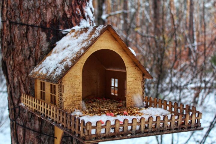 Кормушку можно сделать своими руками или купить на маркетплейсах. Стоит отдать предпочтение конструкциям в виде домика, так как у других вариантов есть определённые минусы. Чтобы уберечь корм от ворон и голубей, нужно делать кормушки с низкой крышей, которые подходят только для мелких птиц.