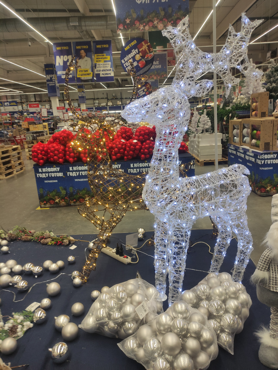 Всем доброго времени суток!!! По заголовку статьи многие наверное подумали про метро'. Но нет, не метро', а Ме'тро. Обратите внимание на ударение. Вообще полностью раньше магазин назывался Метро кэш энд Керри. Это был, а возможно до сих пор и есть, немецкий оптово-розничный магазин. Очень-очень давно я там не была. Как-то не по пути, да и цены там выше сетевых магазинов. Хотя бывают различные акции и скидки, как и везде. Сегодня была там проездом, решила заглянуть. Раньше мне очень нравилось оформление Новогодних товаров в этом магазине. Всё подряд не фотографировала, только то, что привлекло моё внимание. Сразу скажу, что раньше товар был более разнообразным. Сейчас ассортимент сократился на много. Несмотря на огромные цены, товар хорошо распродавался. Это было раньше, пять лет назад, когда я там работала. Не знаю как сейчас, а раньше с середины декабря на многие товары Новогоднего ассортимента, начинались различные акции с понижением цены. А 30 и 31 декабря скидки были