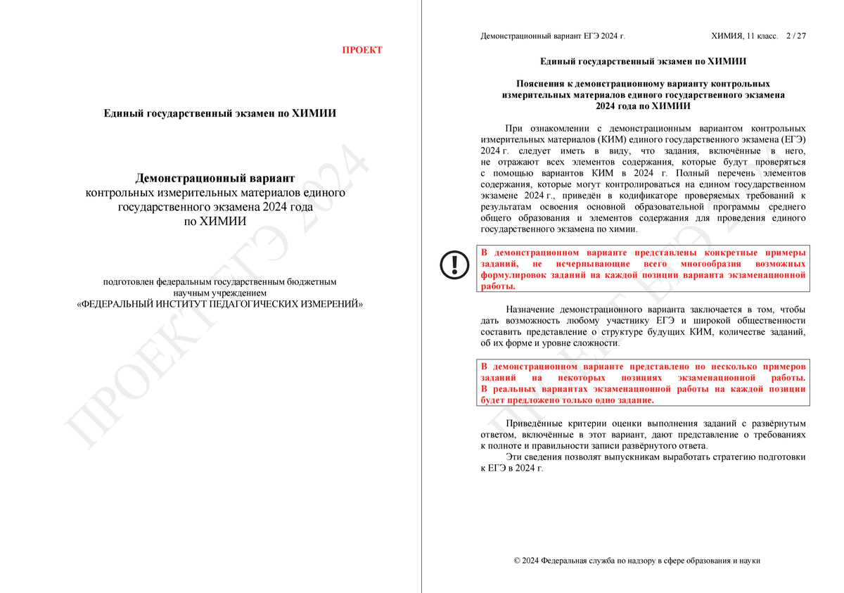 Демонстрационный вариант ЕГЭ 2024 г. ХИМИЯ, 11 класс. Федеральная служба по надзору в сфере образования и науки