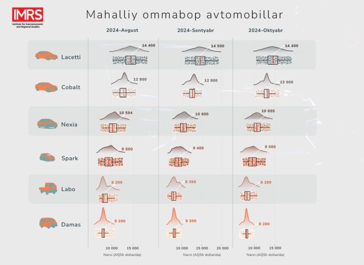 В сегменте отечественных автомобилей наблюдалось снижение средних цен на модели Lacetti, Damas и Labo. Стоимость Lacetti с большим пробегом составила 13 300 долларов США (снижение на 1,5% по сравнению с сентябрем), а с малым пробегом – 15 236 долларов США (снижение также на 1,5%). Damas с большим пробегом подешевел на 6,3% до 7 500 долларов, а с малым пробегом — незначительно до 8 250 долларов. Labo потерял в цене 2%, однако точные цифры ИМРИ не приводит. В то же время, средняя стоимость Spark продемонстрировала рост на 2,2%, достигнув 10 500 долларов США за автомобили с малым пробегом и 9 200 долларов США за автомобили с большим пробегом. Цены на модели Cobalt и Nexia остались практически без изменений.