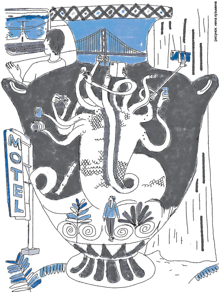 У нас был намечен очень стандартный туристический маршрут, который начинался с моста Золотые ворота. Мы забрались на смотровую площадку рядом с заливом и, с трудом припарковавшись, вылезли, чтобы попросить стоявших рядом зевак нас сфотографировать (против солнца и с неправильного ракурса, как полагается). Когда мы уже собирались двигаться дальше, к нам вдруг подошли два туриста из Китая и на ломаном английском попросили их сфотографировать. Я сфотографировал. Они забрали свой телефон и, посмотрев на результаты, чему‑то очень сильно удивились. Может, тому, что кто‑то впервые снял их на «портрет».
