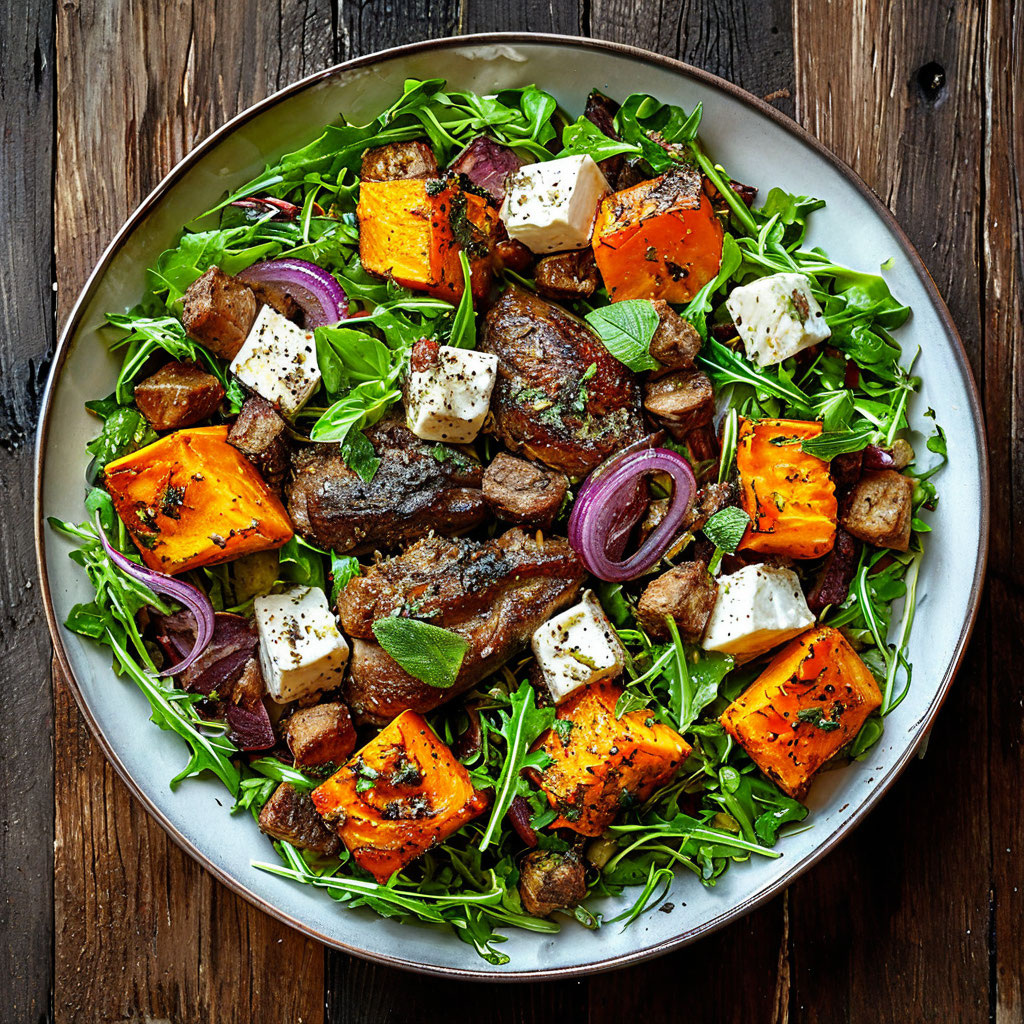 Ингредиенты: - тыква — 400г - свёкла — 2шт. - рукола — 50г - лук фиолетовый — ½ шт. - печень куриная — 250г - сыр фета — 50г - соль — щепотка (по вкусу) - перец чёрный молотый — щепотка (по вкусу) - прованские травы — щепотка (по вкусу) - мука пшеничная — 1 ст. л. для поджаривания печени. Соус: - оливковое масло — 2 ст.л. - соевый соус — 1 ст.л. - лимонный сок — 1ст.л. - горчица в зёрнах — ½ ст.л. - мёд натуральный — ½ ст.л. Приготовление: 1. Для начала приготовим тыкву и свёклу. Тыкву нужно почистить, порезать на кусочки и запечь. Запекать будем так: противень застилаем листом пергамента, по нему распределяем кусочки тыквы, поливаем оливковым маслом, посыпаем солью, чёрным молотым перцем и прованскими травами. Свёклу хорошо моем, заворачиваем в фольгу и кладём на тот же противень. Ставим все это запекаться в духовку при температуре 180 градусов 40-50 минут. Тыква запекается быстрее, поэтому и достать из духовки её нужно раньше. А свёклу продолжаем запекать в течение ещё 30 минут. 2.