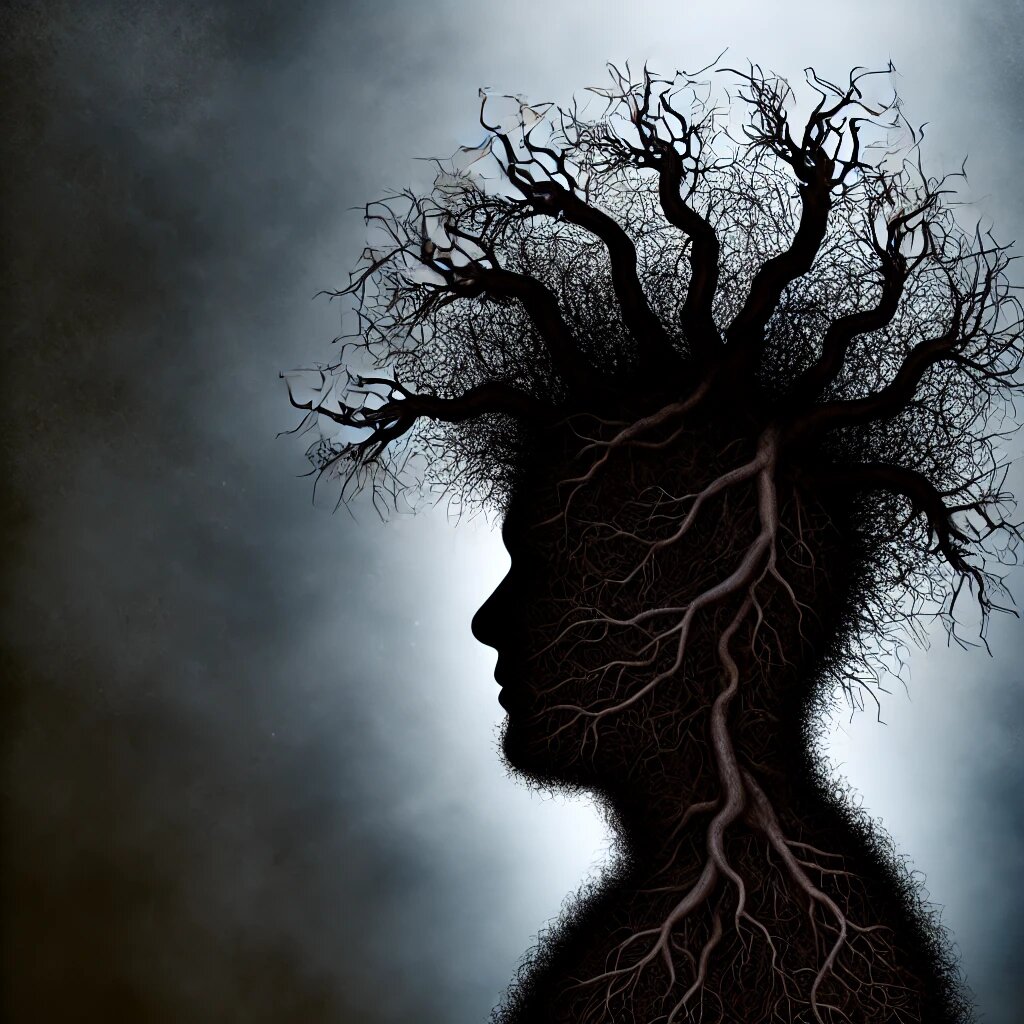 На изображении изображён человек с темными, запутанными корнями, растущими из его головы. Эти корни символизируют негативные глубинные убеждения, которые сковывают его возможности. Темные тендеры охватывают его тело, создавая ощущение, что эти убеждения мешают ему расти. Однако, как и в случае с любыми глубинными убеждениями, есть надежда — свет, который пробивается сквозь тьму, символизирует возможность изменений и освобождения от этих ограничений.