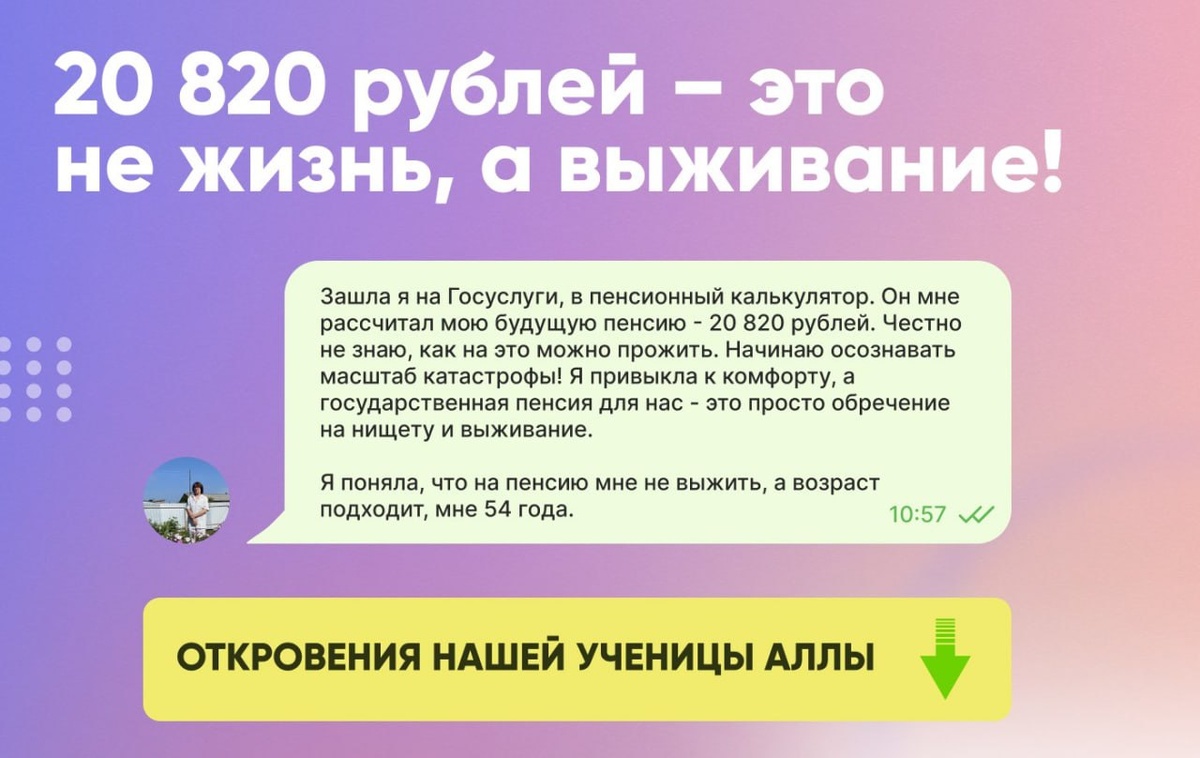 “Зашла я на Госуслуги, в пенсионный калькулятор. Он мне рассчитал мою будущую пенсию - 20 820 рублей. Честно не знаю, как на это можно прожить. Начинаю осознавать масштаб катастрофы! Я привыкла к комфорту, а государственная пенсия для нас - это просто обречение на нищету и выживание.