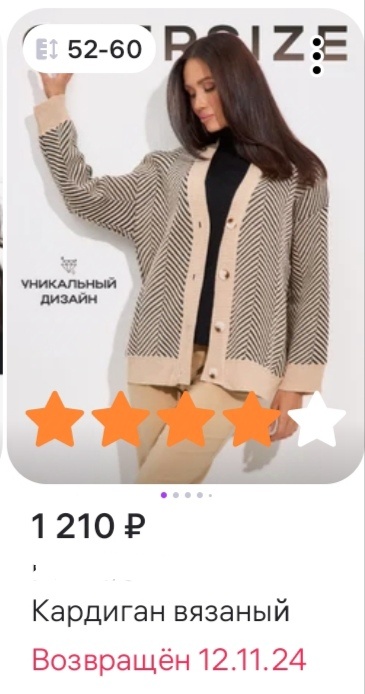 Приветствую дорогих подписчиков! Сегодня буду мало писать, потому что время уже много, а я хочу статью выложить пораньше, пока ещё не все мои читатели спят😄 Зато будет много фото😉 Это тоже хорошо. С утра поработала в полную силу, а днём сходила в пункт выдачи WB, и отказалась от получения кардигана. Качество кофточки нормальное, но на мне она как на газели седло смотрится. И колется к тому-же. И коротковата. В общем, не стала получать. А мне вот хочется чего-то вот примерно такого, чтобы можно было наверх, на футболку надеть. Извинилась у девушки, которая там работает, сказала ей - простите, но мне не подошло. Она с улыбкой ответила, что вчера вернула 18!!! пар обуви от одного клиента)) А к новому году нагрузка у них начинает увеличиваться, уже по три машины за день товара привозят. Люди заказывают подарки 🎁 к празднику, новые наряды на корпоративы. А это не просто, одной работать, при такой нагрузке. Прими товар, потом верни товар. Да уж, работа у них не из лёгких. Везде раб