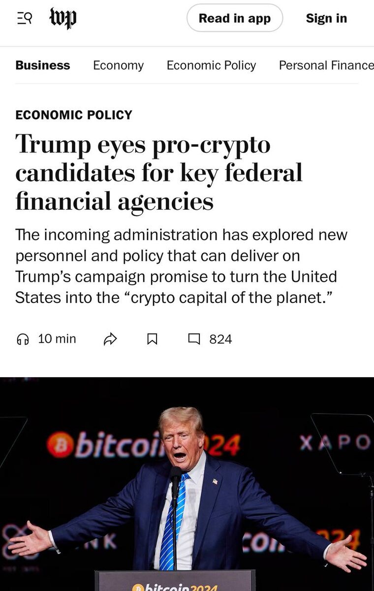 Избранный президент США Дональд Трамп рассматривает возможность назначения на ключевые должности в правительстве кандидатов, поддерживающих криптовалюты💲🪙 Советники политика консультируются с руководителями криптокомпаний касательно возможных изменений в федеральной политике, отметили СМИ. На пост министра финансов рассматривается миллиардер Скотт Бессент На должность главы Комиссии по ценным бумагам и биржам США фаворитом является Дэниел Галлахер - главный юрист Robinhood и экс-сотрудник ведомства в 2011-2015 годах Источник Криптовалютой торгую на бирже Bybit. #BTC