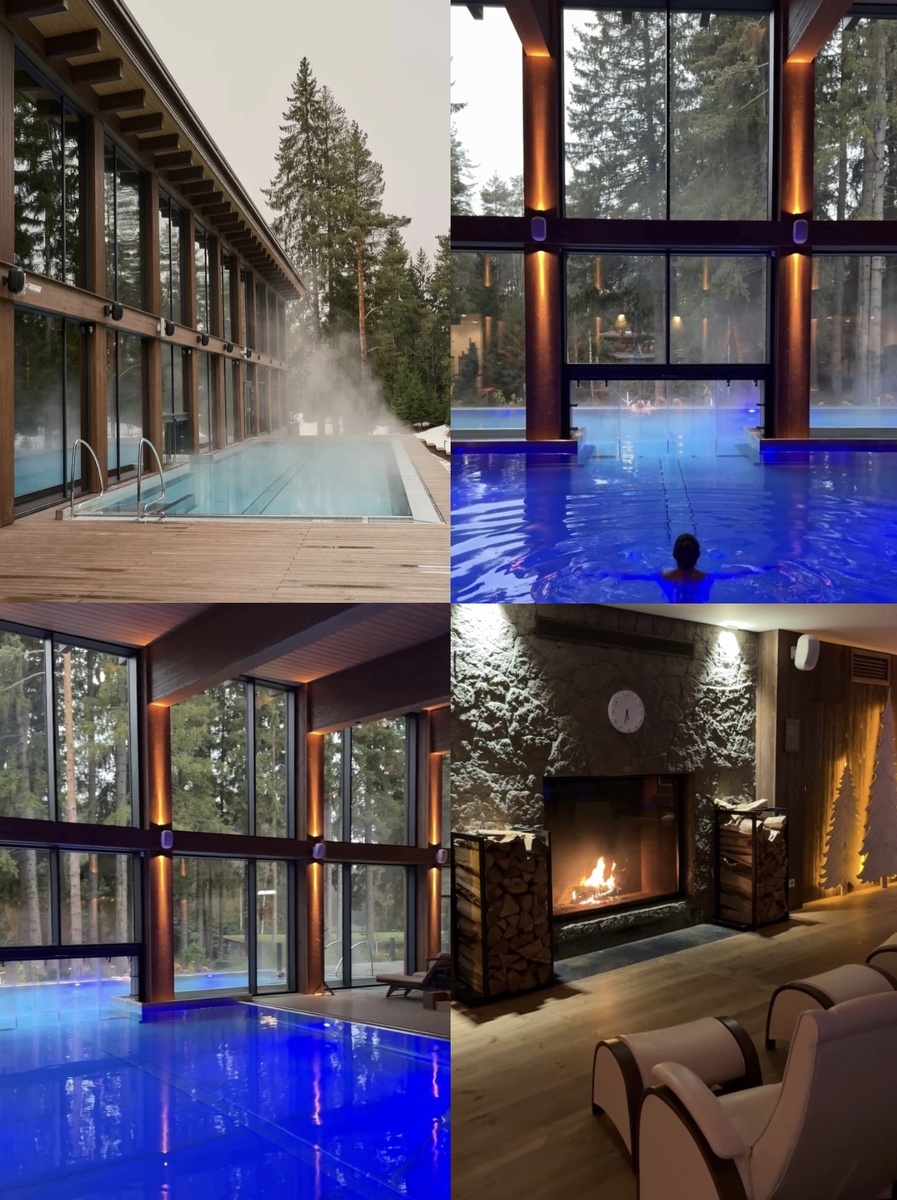 Подогреваемые уличные бассейны, которые будут теплыми в любую погоду, в том числе и зимой: В комплексе несколько открытых бассейнов: 2 с пресной водой и 1 с минеральной. Самый большой и впечатляющий из них имеет прозрачные автоматические раздвижные дверцы прямо в воде для доступа из зоны внутренней чаши бассейна во внешнюю уличную. В бассейне с минеральной водой, помимо зоны для плавания, есть лежаки для подводного гидромассажа. Спа-комплекс находится посреди соснового леса. Вечером деревья подсвечиваются, создавая особенно волшебную атмосферу. Многие наслышаны про Охта парк за счет его сказочного лесного катка, так вот, термальный спа-комплекс находится здесь же и выглядит не менее волшебно. Место идеально для тех, кому важна эстетика, так как все очень стильно и современно, большие панорамные окна. Помимо бассейнов, в термальной зоне есть несколько панорамных саун, одна из которых с гималайской солью, хаммамы с соляной стеной и кедровая парная. Для закаливания - комната со снегом, в