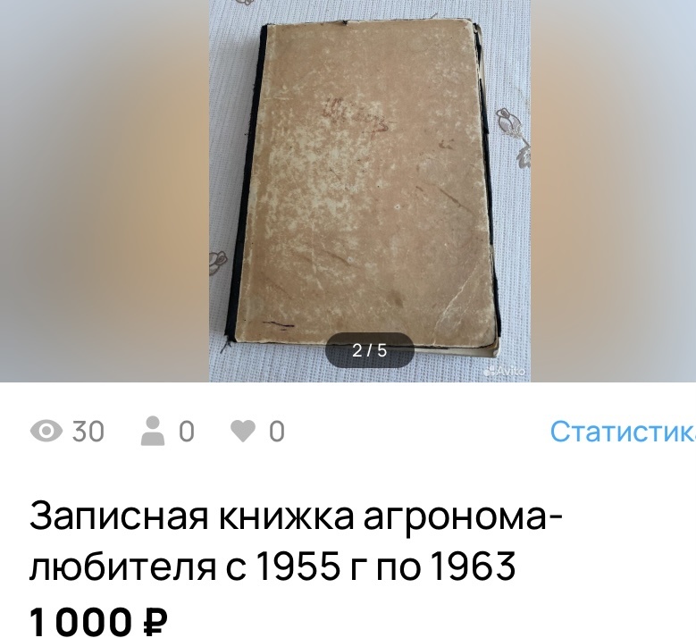 Я долго думала, рассказывать об этом эпизоде моей жизни или нет. Через месяц после сделки начала пост и оставила, сегодня к нему возвратилась: очень уж необычная и неожиданная покупка была. Расскажу подробнее. Я выставила на Авито блокнот с записями агронома без всякой надежды, что его возьмут. Цену поставила - 1000 рублей, так как меня терзали сомнения: продавать или нет. Записи агроном делал в конце 1950-х-начале 1960-х годов. Записи очень аккуратные, грамотные, ежедневные наблюдения за погодой и растениями. Достался мне этот блокнот случайно. Их было несколько, но те с другими записями. Я прочитала их все, находилась под большим впечатлением, пожалела, что сейчас все записи ведутся в телефонах и компьютере: вряд ли кто-нибудь их прочтёт через 60 лет. Месяца не прошло, мне позвонили и в этот же день за блокнотом приехали двое молодых людей на дорогой машине. Я спросила, слышали ли они что-нибудь об авторе блокнота и назвала его фамилию. Они ответили, что не знали его и ничего о нём н