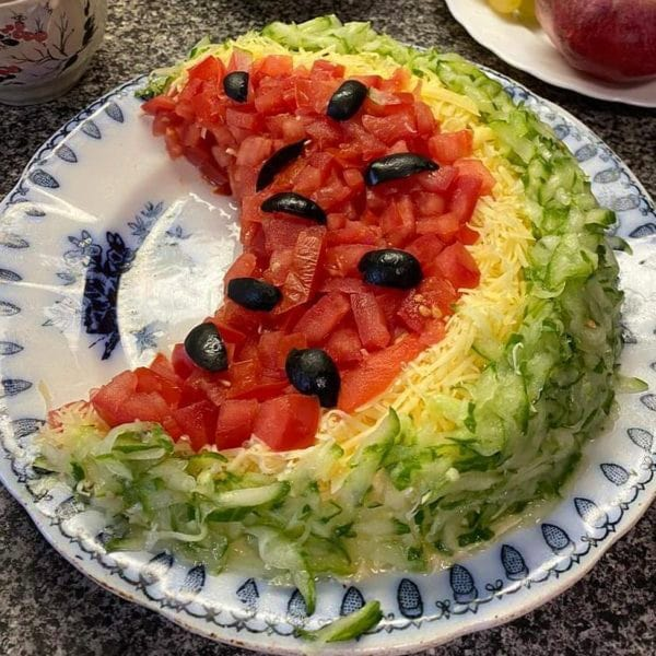 - Далее нужно на мелкой терке натереть твердый сыр. Выкладываем слой сыра и смазываем майонезом. Посыпаем сыром край салата, делаем так сказать полумесяц из сыра, его смазывать майонезом не нужно. Это будет белая мякоть на корке арбуза.