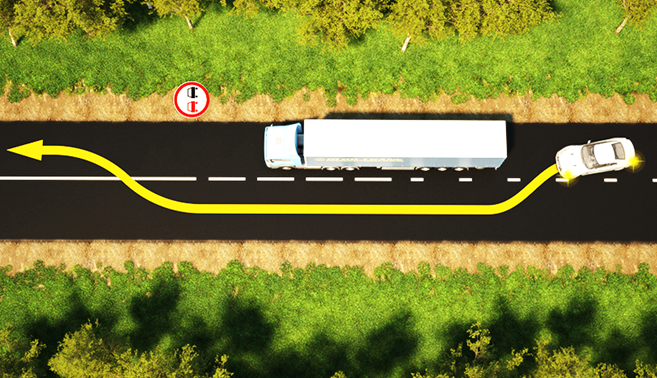 "Обгонять или не обгонять, вот в чем вопрос". Обычно опытный водитель с большим стажем уже настолько чувствует дорогу и хорошо оценивает движение, что вопрос обгона у него долго не сидит в голове. Прерывистая линия, встречного движения нет, знака, запрещающего обгон нет, вперёд! На поворотах и подъемах об обгоне думать нельзя! Но менее опытные водители иногда бывают не уверенны в себе. С одной стороны это даже лучше, потому что такие люди будут точно уверены, при обгоне, что они его завершат успешно. Но хоть вы и опытный водители, или же только начинающий, или ездите уже достаточное количество лет, но не можете себя отнести ни к тем, ни к другим, никто из вас не застрахован от следующей ситуации. Представьте, вы едете по трассе, и начинается короткий участок дороги, на котором обгон разрешен. Вы включаете поворотник, убеждаетесь, что на встречной полосе нет машин и начинаете выполнять манёвр. А обгоняете вы длинную фуру и уже на половине её длины вы видите, что линия разметки становит
